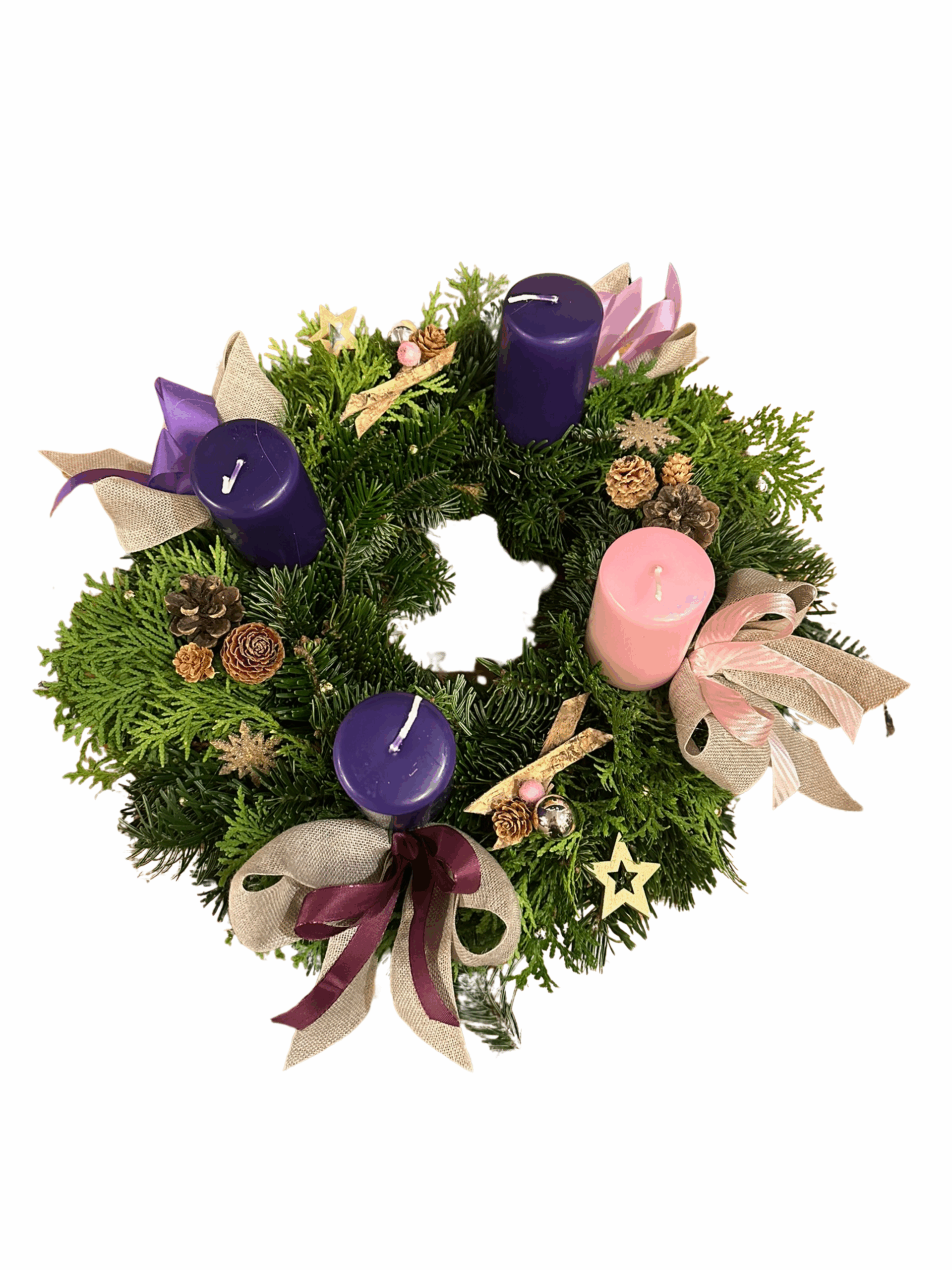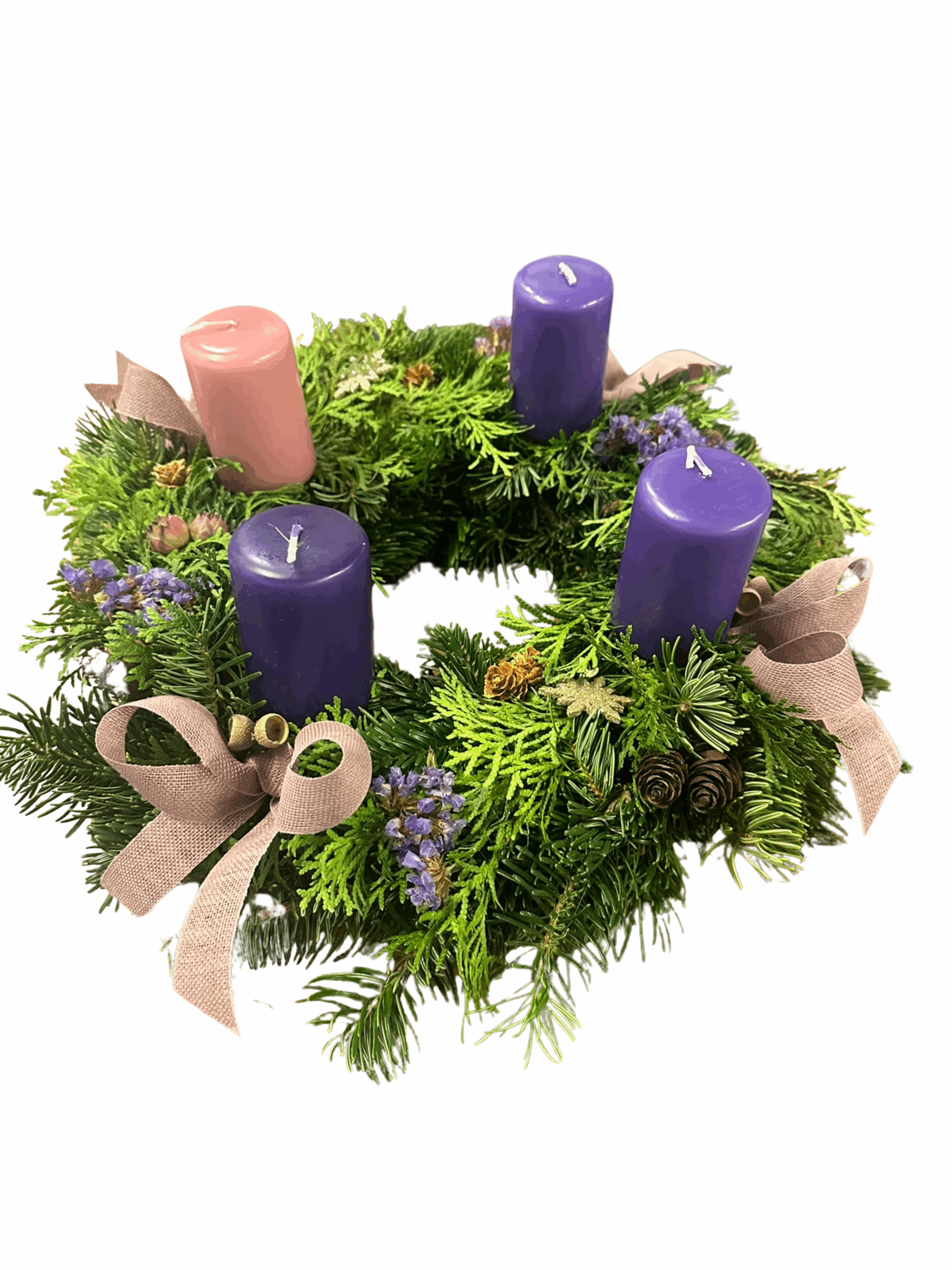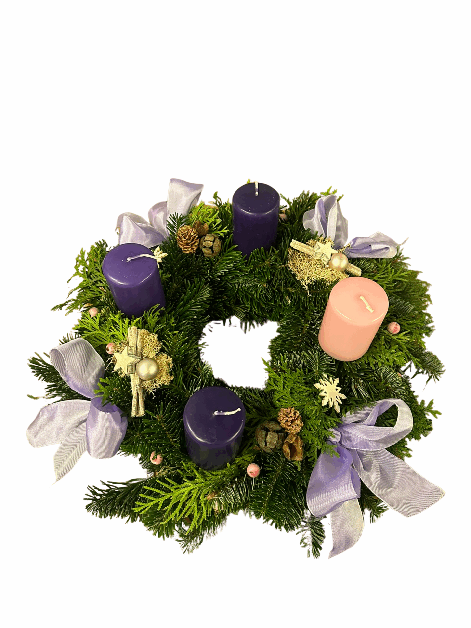 Adventkranz mit der Kerzenfarbe liturgisch. Bei der Dekoration könnt ihr zwischen dem Adventkranz „Klassik“ (Bockerl und Maschen) oder „Geschmückt“ (Klassik plus Naturdekoration) entscheiden.